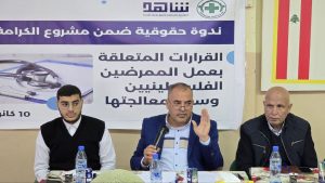 وقدّم الدكتور محمود الحنفي عرضًا قانونيًا للقرارات والمراسيم التي حدّت من قدرة الممرضين الفلسطينيين على مزاولة المهنة، معتبرًا أن الإجراءات الأخيرة أغلقت فعليًا باب العمل أمامهم وتسببت بارتفاع نسب البطالة داخل المخيمات.